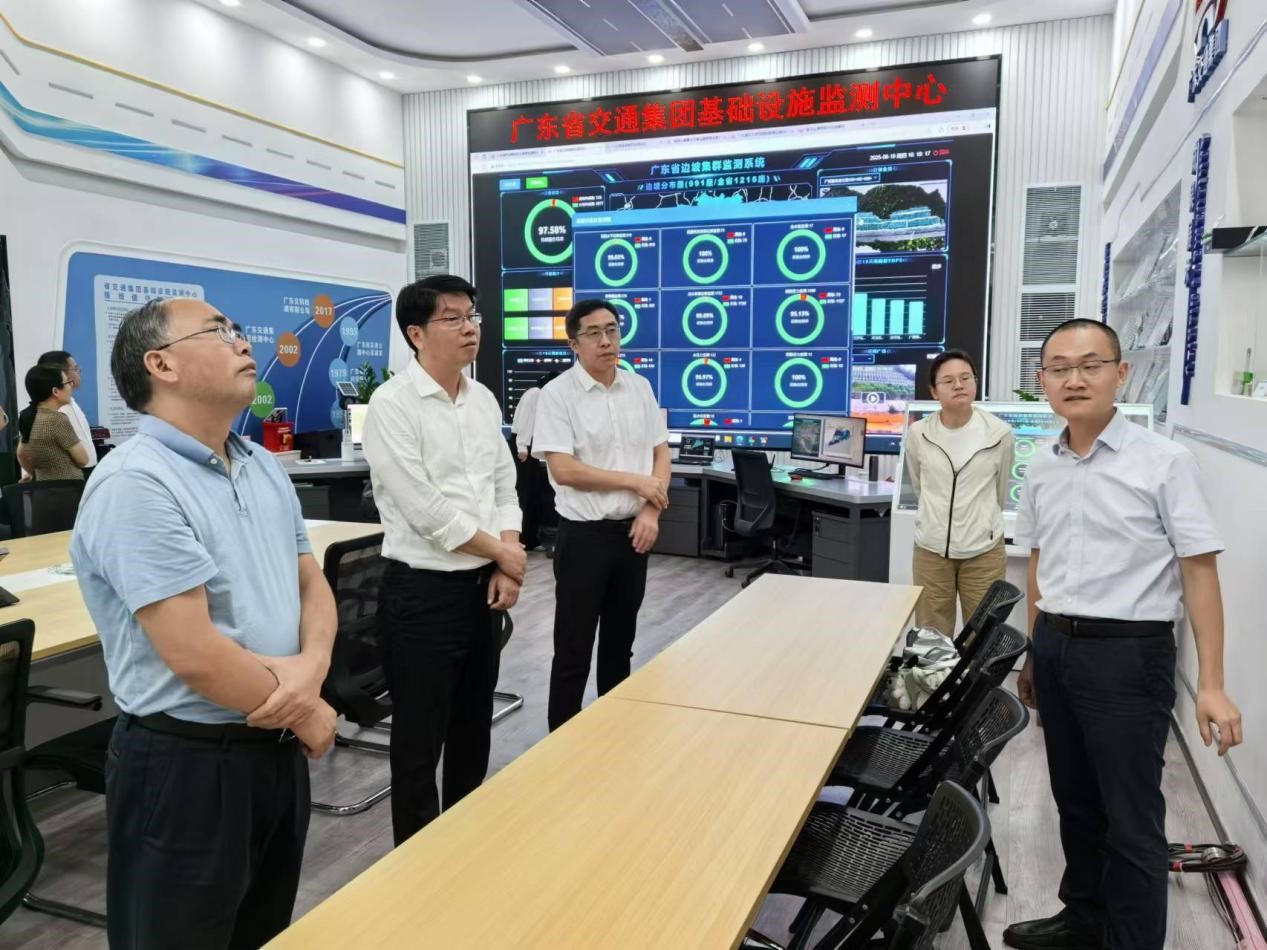 调研组实地参观交通运输行业研发中心、广东省交通集团基础设施监测中心,深入了解其在交通设施运行监测、智能预警与综合调度方面的数字化成果。