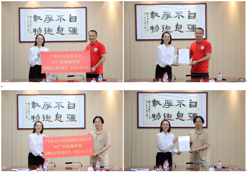 在本次集体捐赠活动中,中山校友分会向学校捐赠总价值20余万元的电子显示屏和伴手礼一批;广东省六七八控股集团股份有限公司与德润餐饮共同出资26.24万元,支持学校会议室升级改造并捐赠配套设备;广州市月亮湾建设工程有限公司为琶洲大礼堂捐建价值26万元电子设备;广东创科智能家具有限公司为郑和堂添置价值92.16万元的家具设施。学校教育基金会与各捐赠单位代表签订捐赠协议。陶韶菁代表学校接受捐赠,并向各单位颁发捐赠证书。