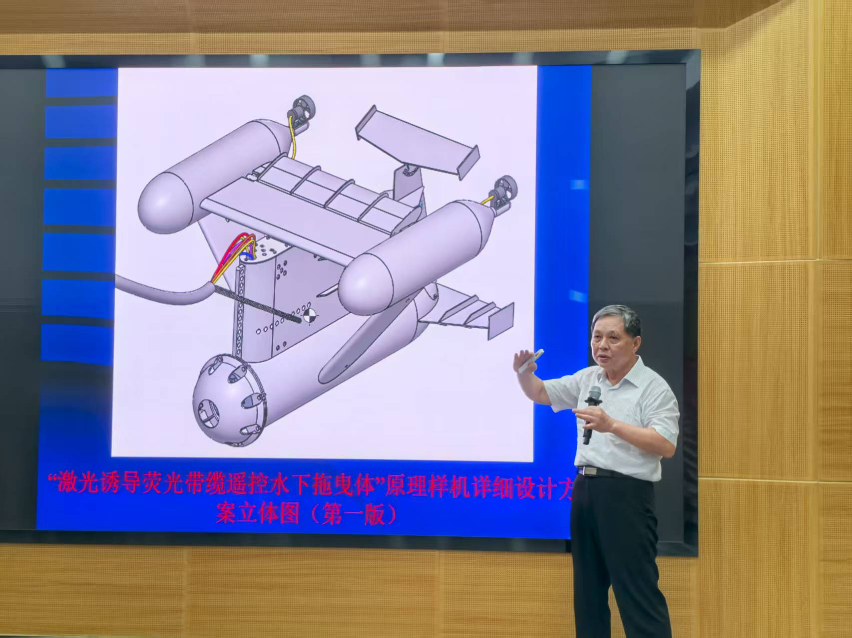 吴家鸣以《激光诱导荧光带缆遥控水下拖曳体研发成果简介》为主题作报告。他重点介绍了其带领的研发团队开展激光诱导荧光带缆遥控水下拖曳体原理样机的研发过程,包括水下拖曳体的水下探测作业功能要求、主尺度及总布置设计、轨迹与姿态控制装置设计,以及原理样机实验室水池试验与海上野外试验的实施过程、研发成果与经验。