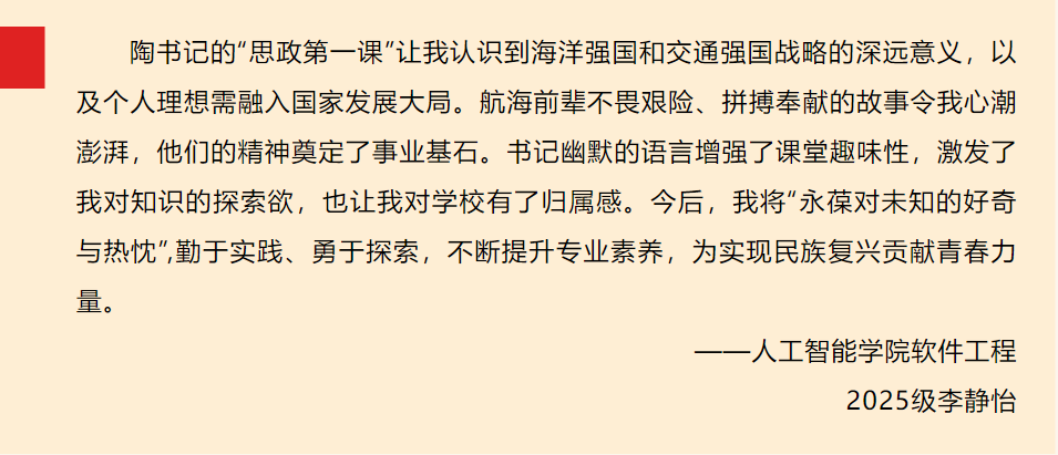 陶韶菁的授课紧紧围绕海洋强国与交通强国战略,从“领航定向”“时代机遇”“广航贡献”和“新生使命”四个方面深入浅出地阐述了新时代青年应如何与时代同进步、与祖国共成长,既有理论指引,又有数据支撑、案例佐证,更饱含着对青年学生的深情关怀。