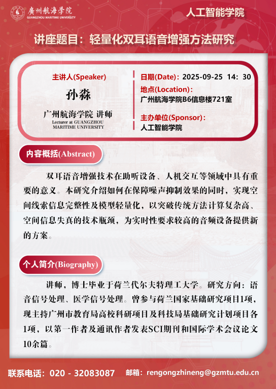 学术讲座预告:孙淼《轻量化双耳语音增强方法研究》